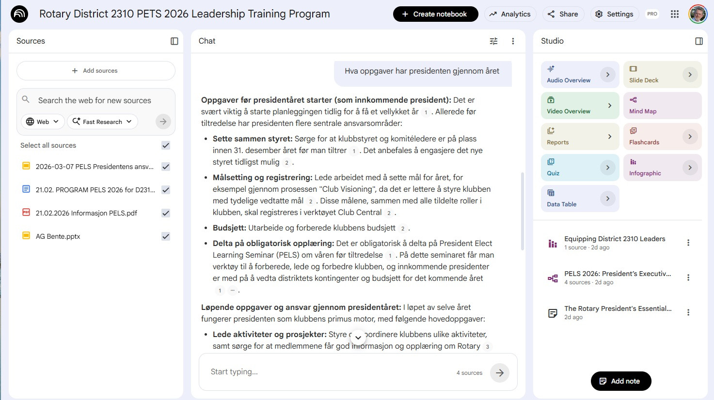 Han demonstrerte NotebookLM (fra Google) som et praktisk verktøy for dette. Han lastet inn Rotary District 2310s presentasjoner fra PELS 2026-programmet, og AI-en klarte deretter å svare på spørsmål om innholdet – for eksempel «hva er presidentens oppgaver?» – basert utelukkende på de opplastede dokumentene.